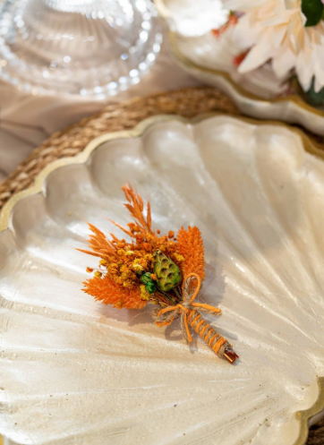 Bu özel tasarım yaka çiçeğimizde gerçek ve şoklanmış çiçekler kullanılmıştır.