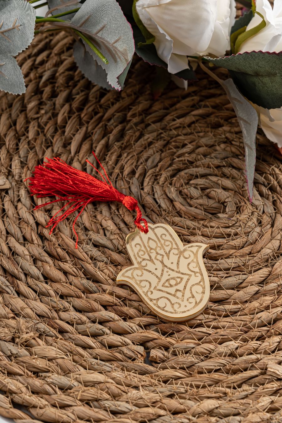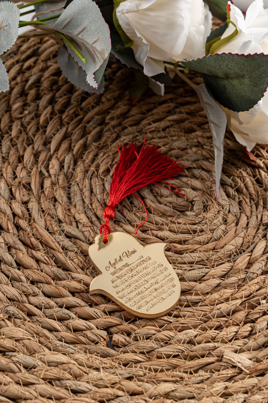 Bir yönünde hamsa kazıma, diğer yüzünde ayetel kürsi kazıma bulunur.