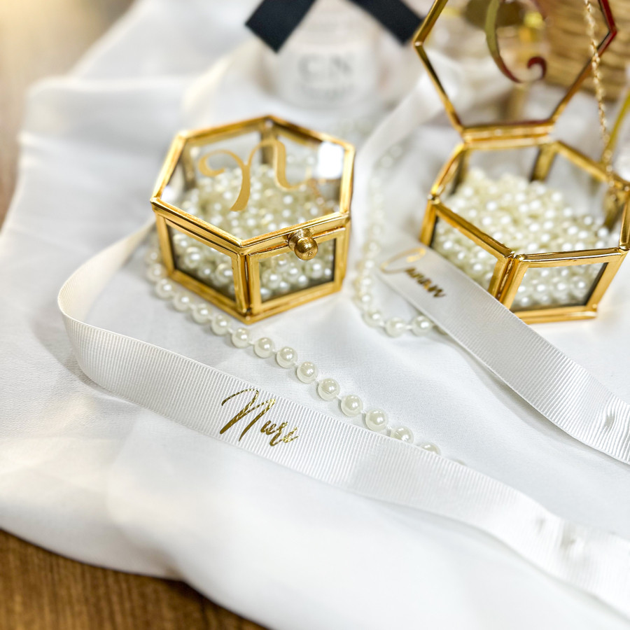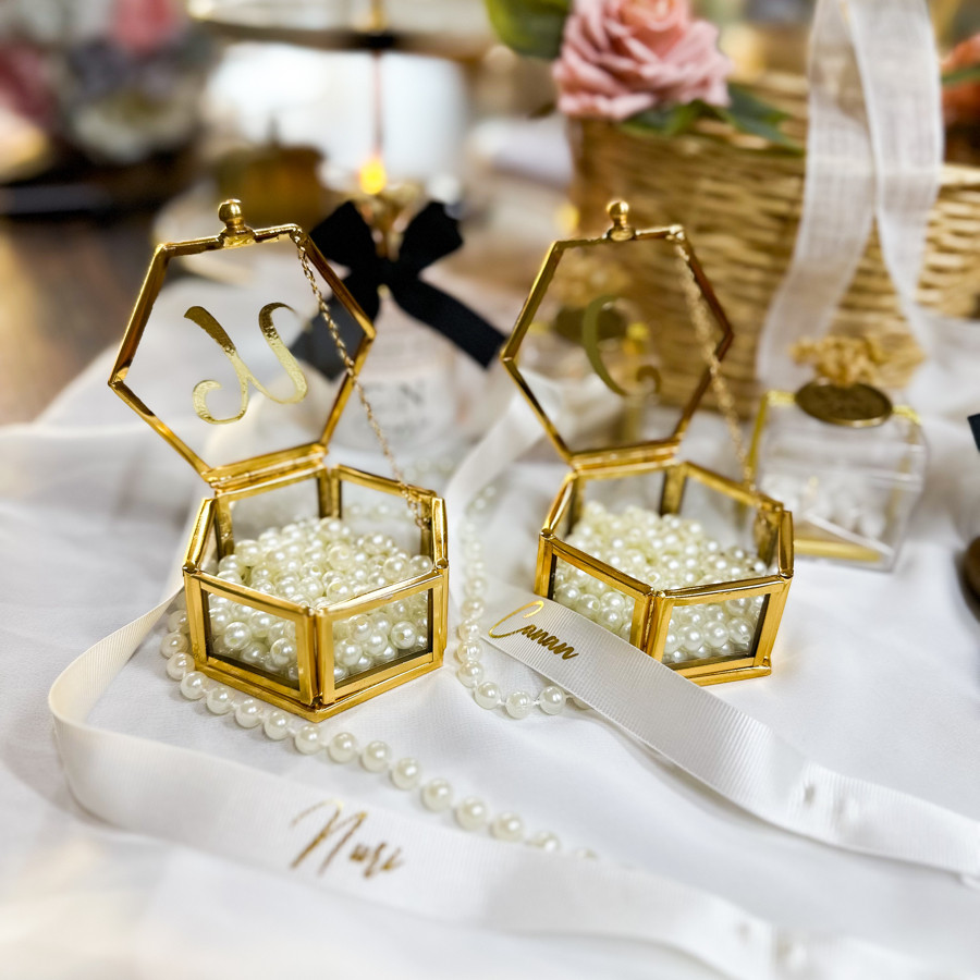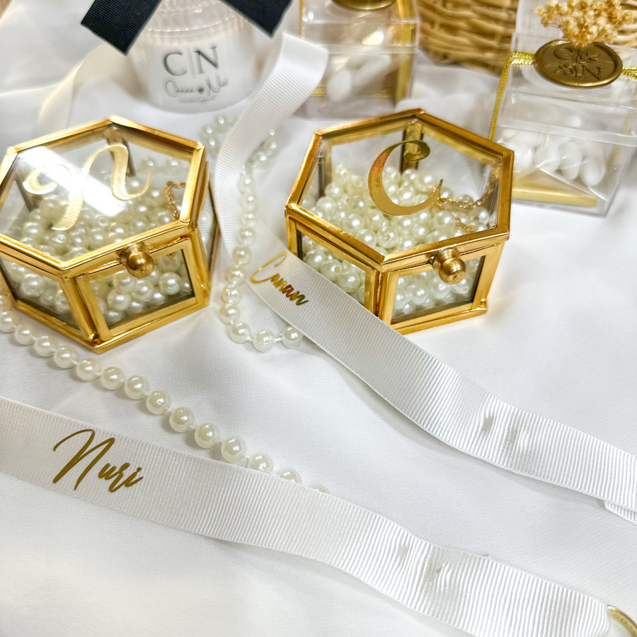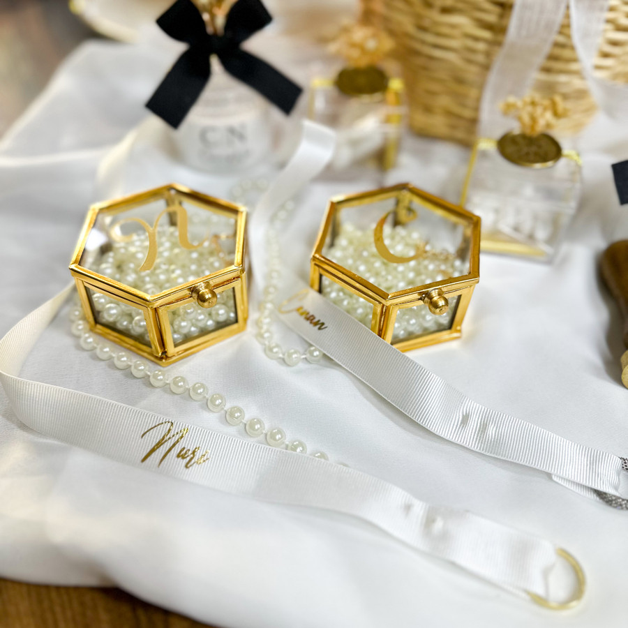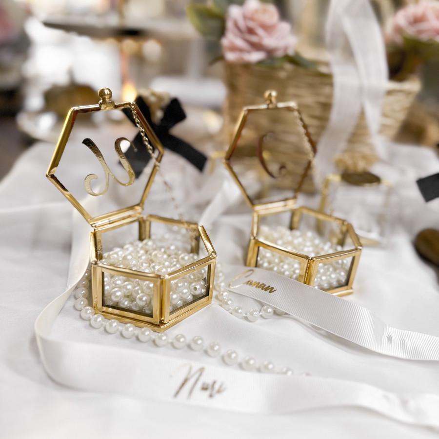 Yüzüklüğümüz 2 adet içinde incileri ve üzerinde harf baskısı ile gönderilir.