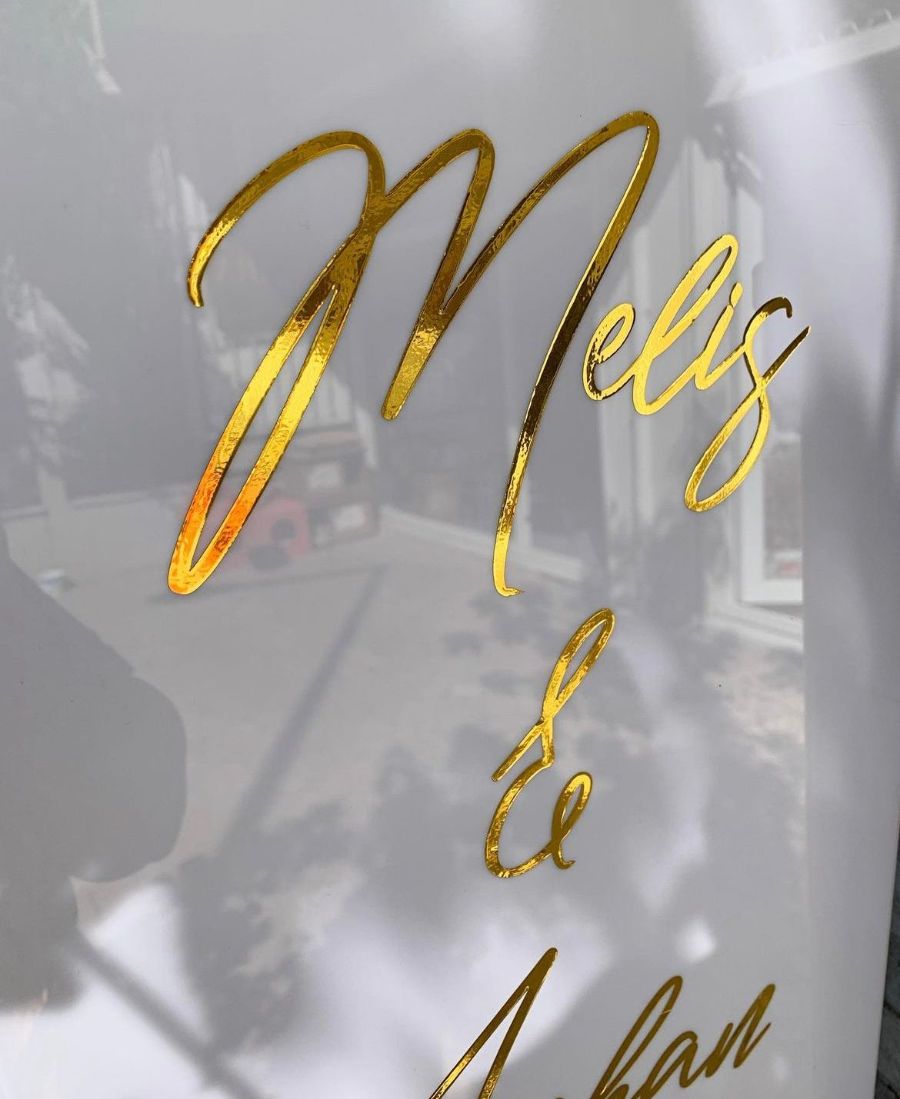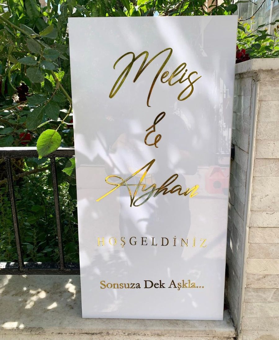 3 mm kalınlığında beyaz pleksi malzemeden üretilmiş olup, üzerindeki yazılar yaldızlı folyo sticker çalışılmıştır.