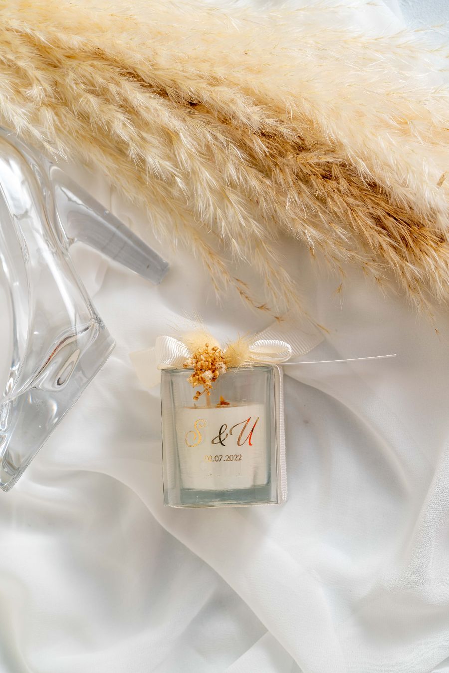 Mum üzerindeki etiketimiz altın yaldızlı çalışılmıştır, ayrıca kutu üzerinde siyah baskılı dokulu kart etiket kullanılmıştır.