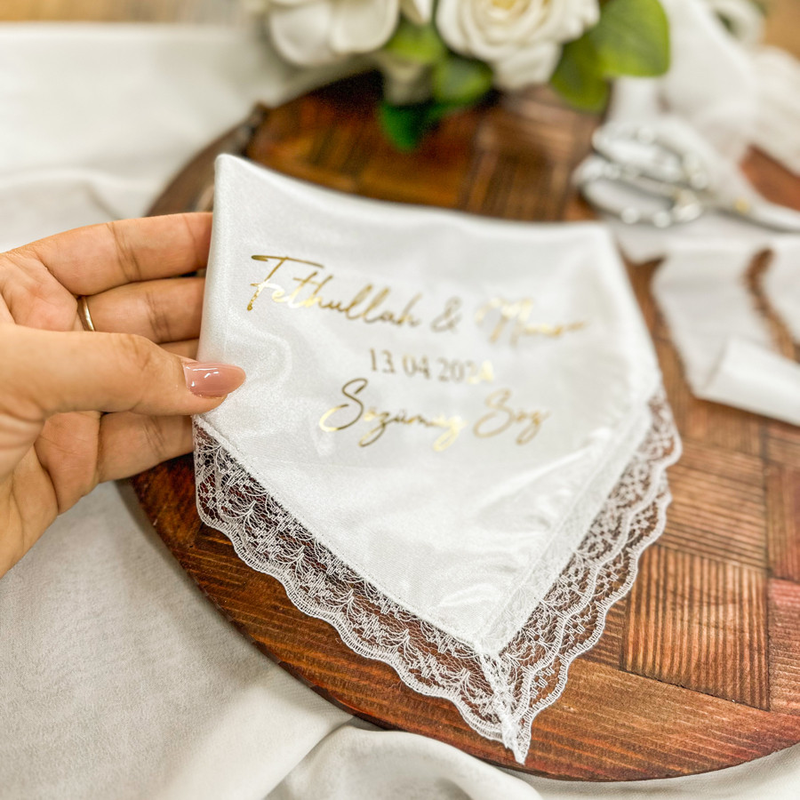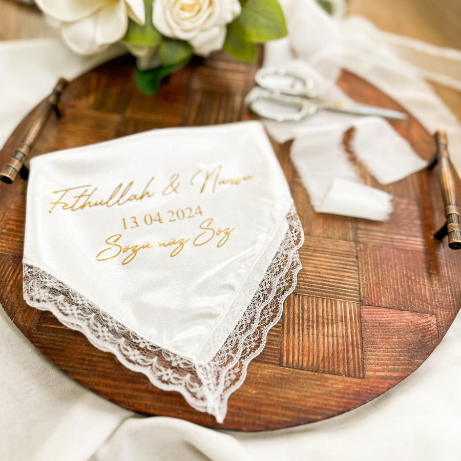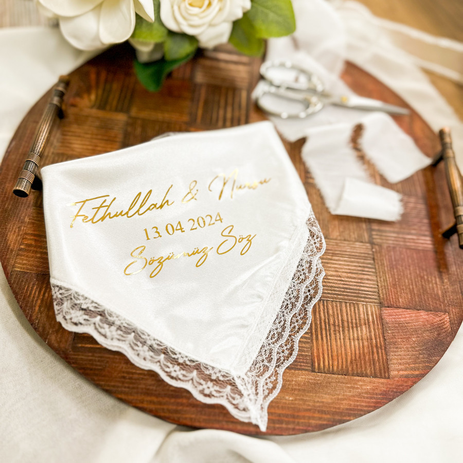 Söz mendili ölçümüz 25x25 cm dir. Kişiye özel hazırlanır. Bilgilerinizi sipariş notunda belirtebilirsiniz.